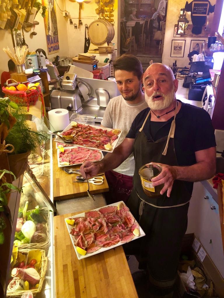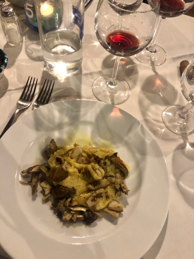 Trattoria da Nonna Clara is known for homemade pasta classics like tagliatelle with tomatoes and basil and ravioli stuffed with ricotta. And, this is my favorite place to savor salty baccala with polenta and leeks. Matt dives headfirst into a plate of wild boar with olives and polenta (Cinghiale).
