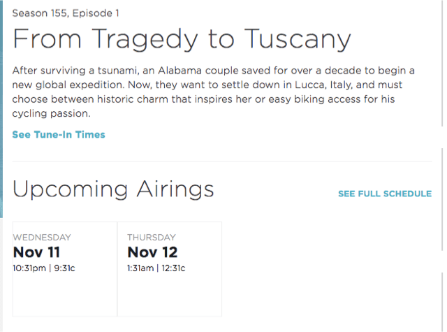 Really liked your House Hunters show. On our first trip to Italy in 2011, we stayed in Florence for 17 days and made day trips on the trains. Lucca was one of the first other places we went. We loved it! After that, we visited, each time for 14-17 days, in 2014, ’15 and ’16. Looking forward to be able to visit Italy again. http://www.italyiswaitingforyou-getgoing.com/