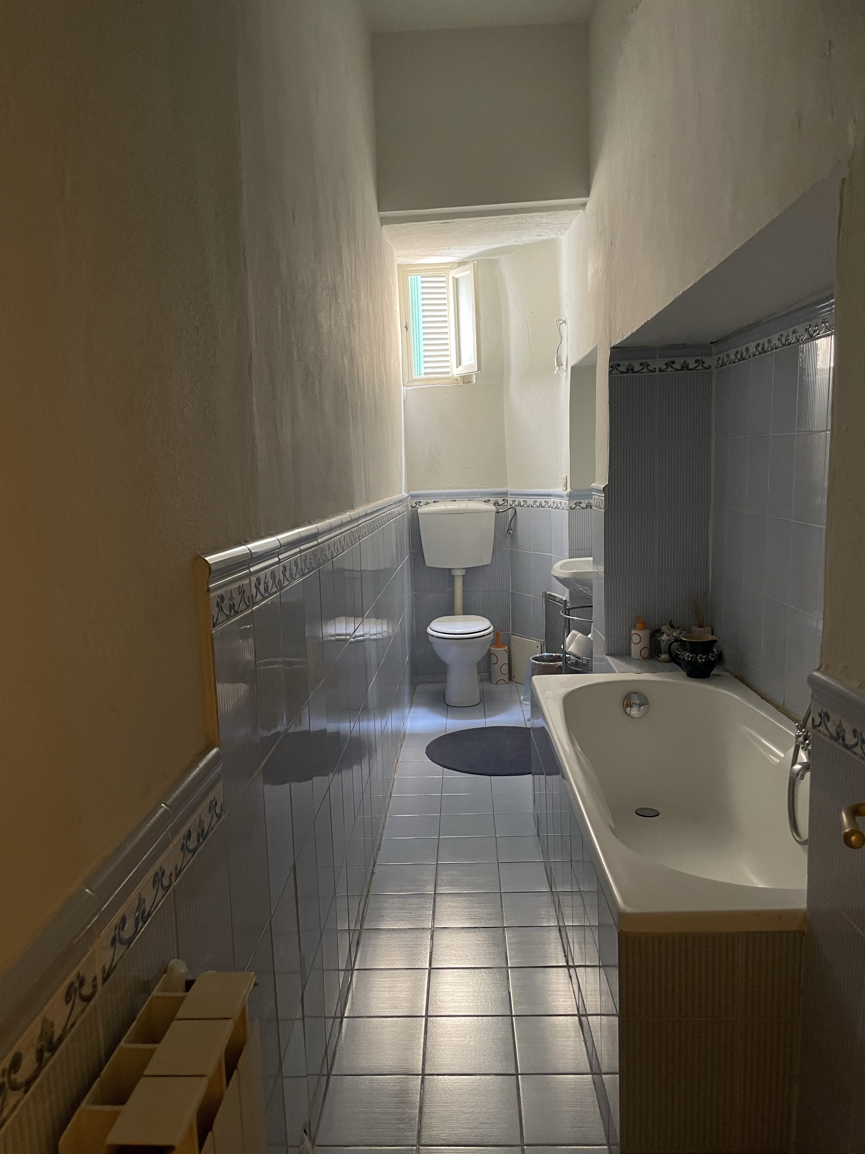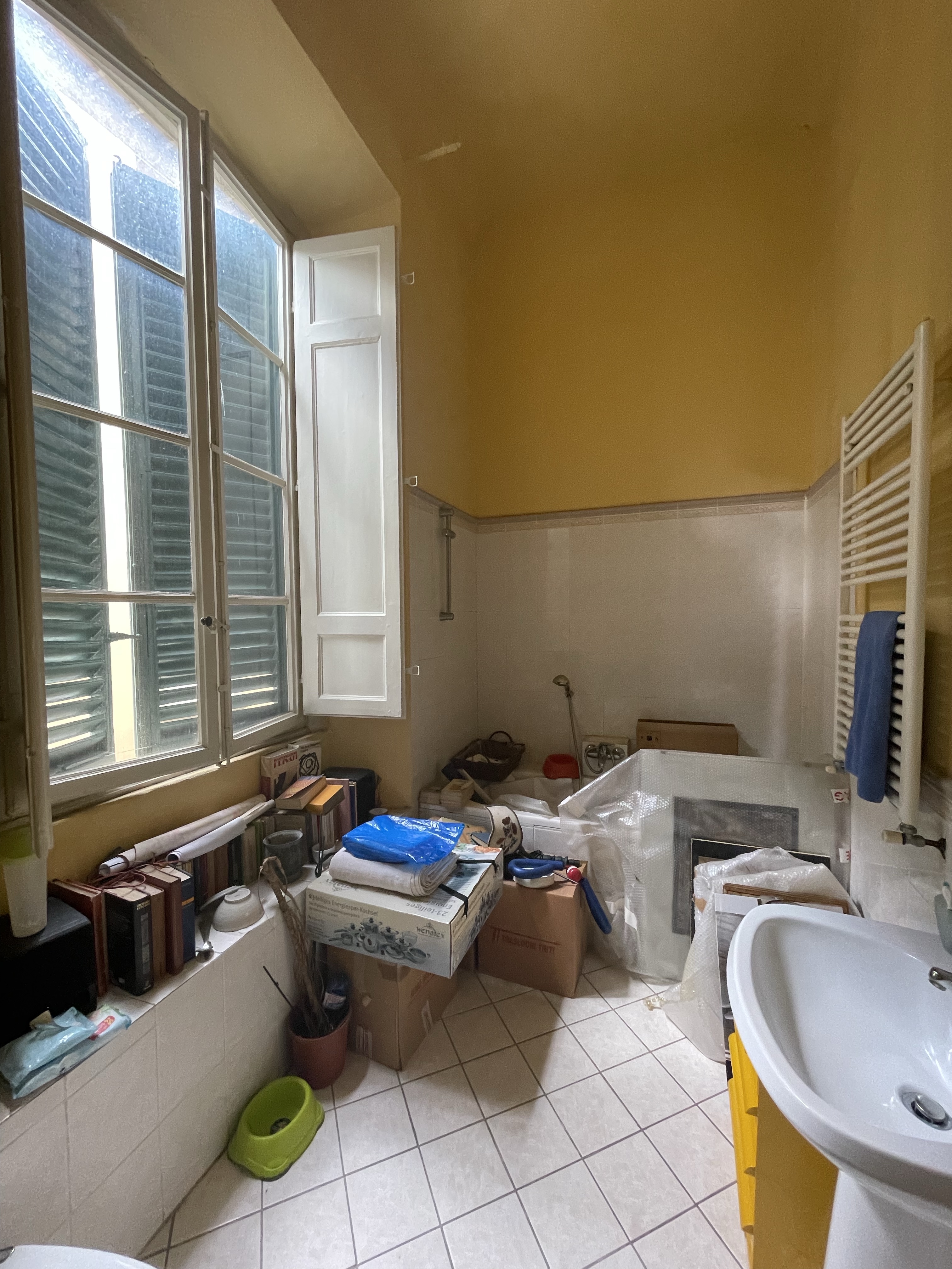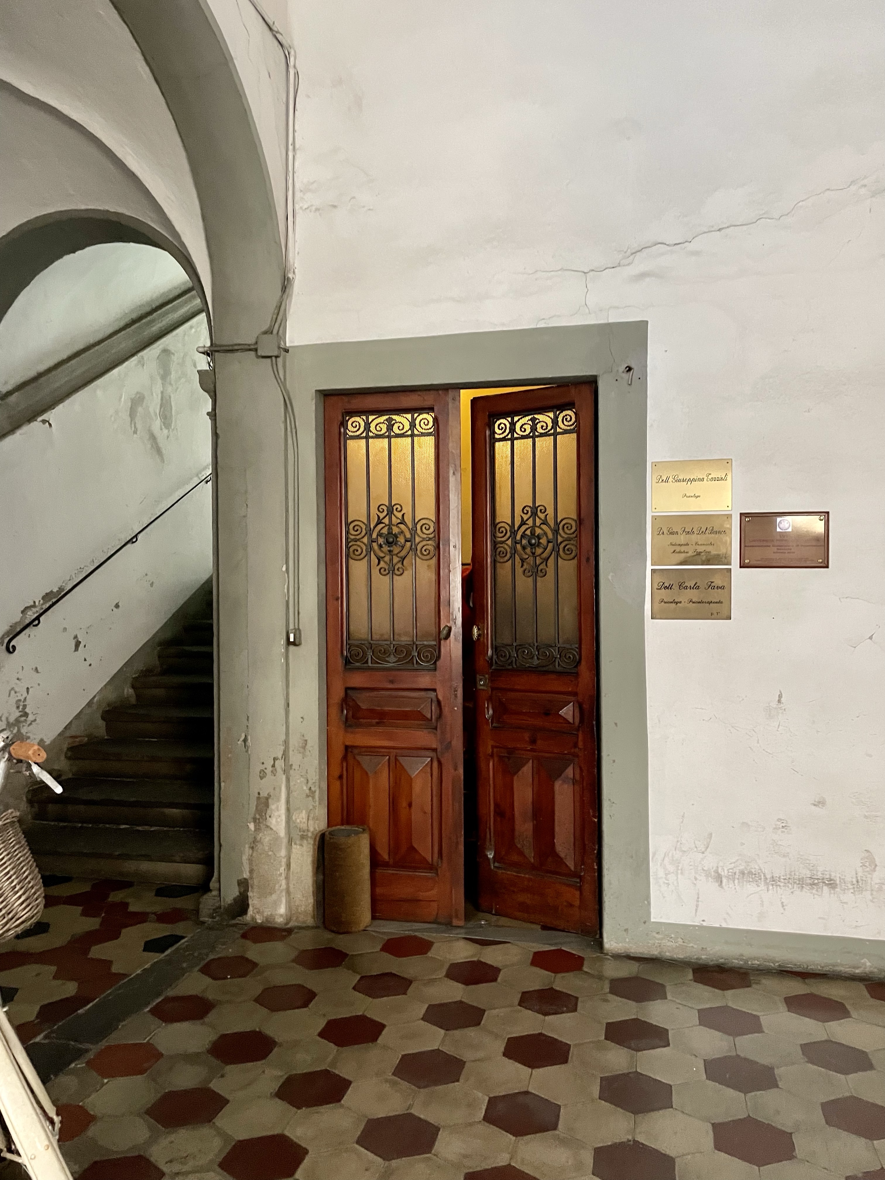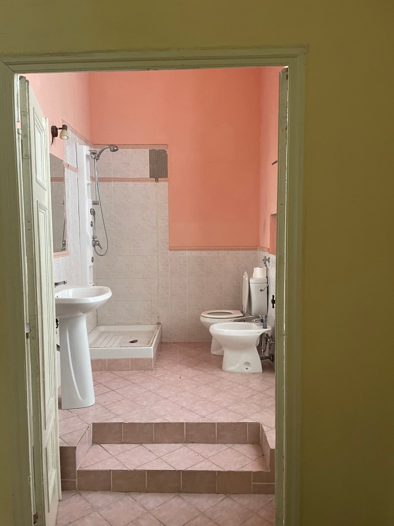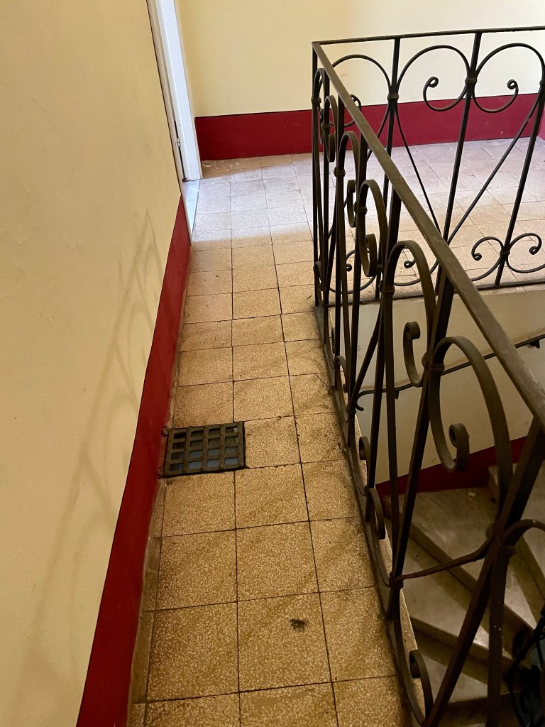 And, then there’s the sheer size of the space. There’s been some strange partitioning of spaces to create an office for three doctors’ practices, but as you know from our last go ‘round, we have an affinity for tearing down walls to create big, open spaces. The kitchen hasn’t been in use in decades and is a complete gut-job, as are the three, uhm, “vintage” bathrooms. What is up with the affinity for pink tile, people? The floors are exquisite in every room, a mixture of centuries old terracotta, fine marble, and that one-hundred-year-old tesseire hand-painted tile which we love so much, however, they look as though they haven’t been cleaned since the days when guests would have arrived by carriage!