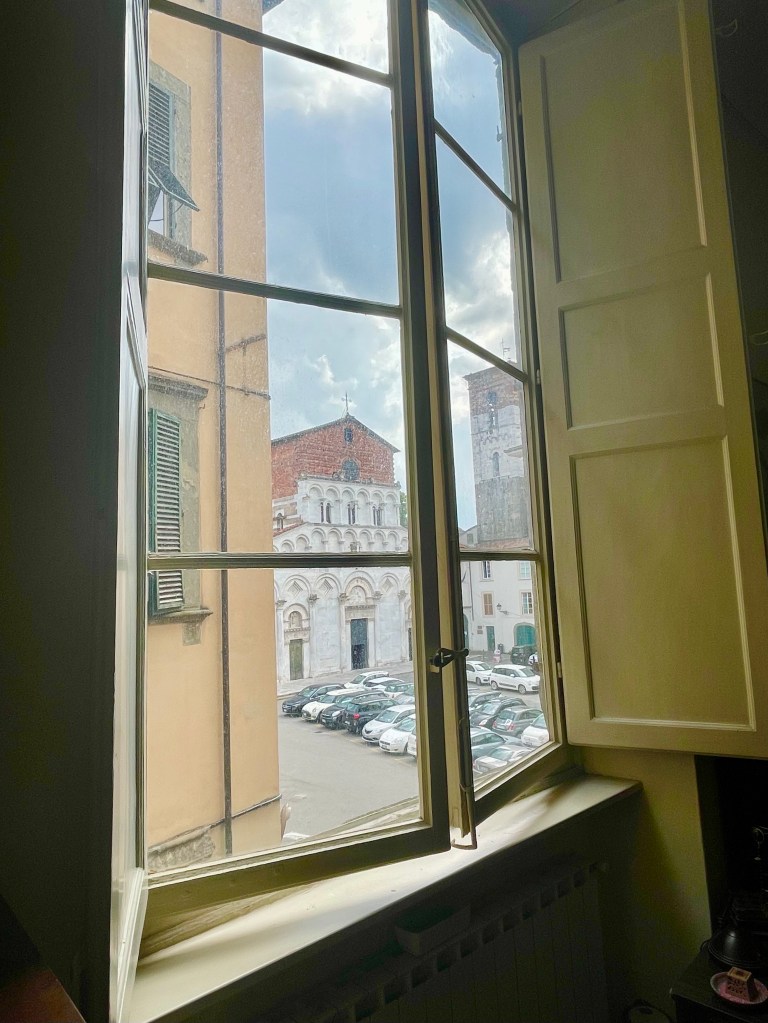 Yep, after all the chatter and patter about fresh air, more serenity, and open space, we chose – without reservation or hesitation – a sprawling apartment in the bustling heart of Lucca, on one of the original Roman roads, and at the intersection of two streets with names that translate as the “Holy Cross” and the “Guardian Angels.” How could we resist that gravitational pull?