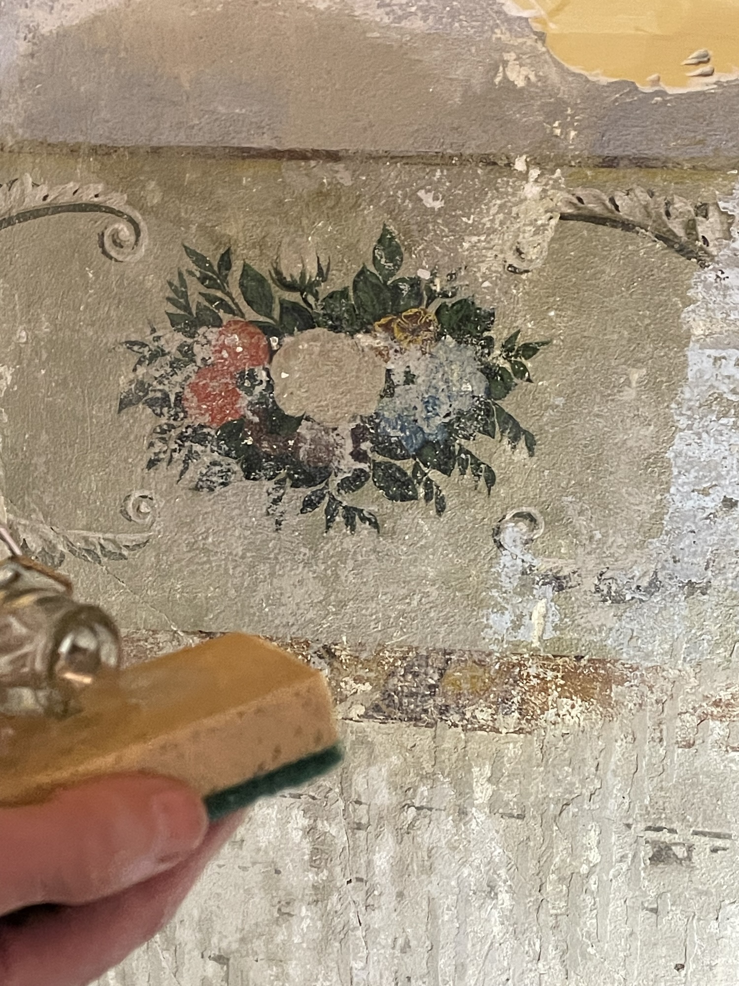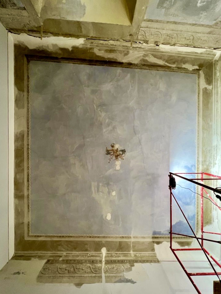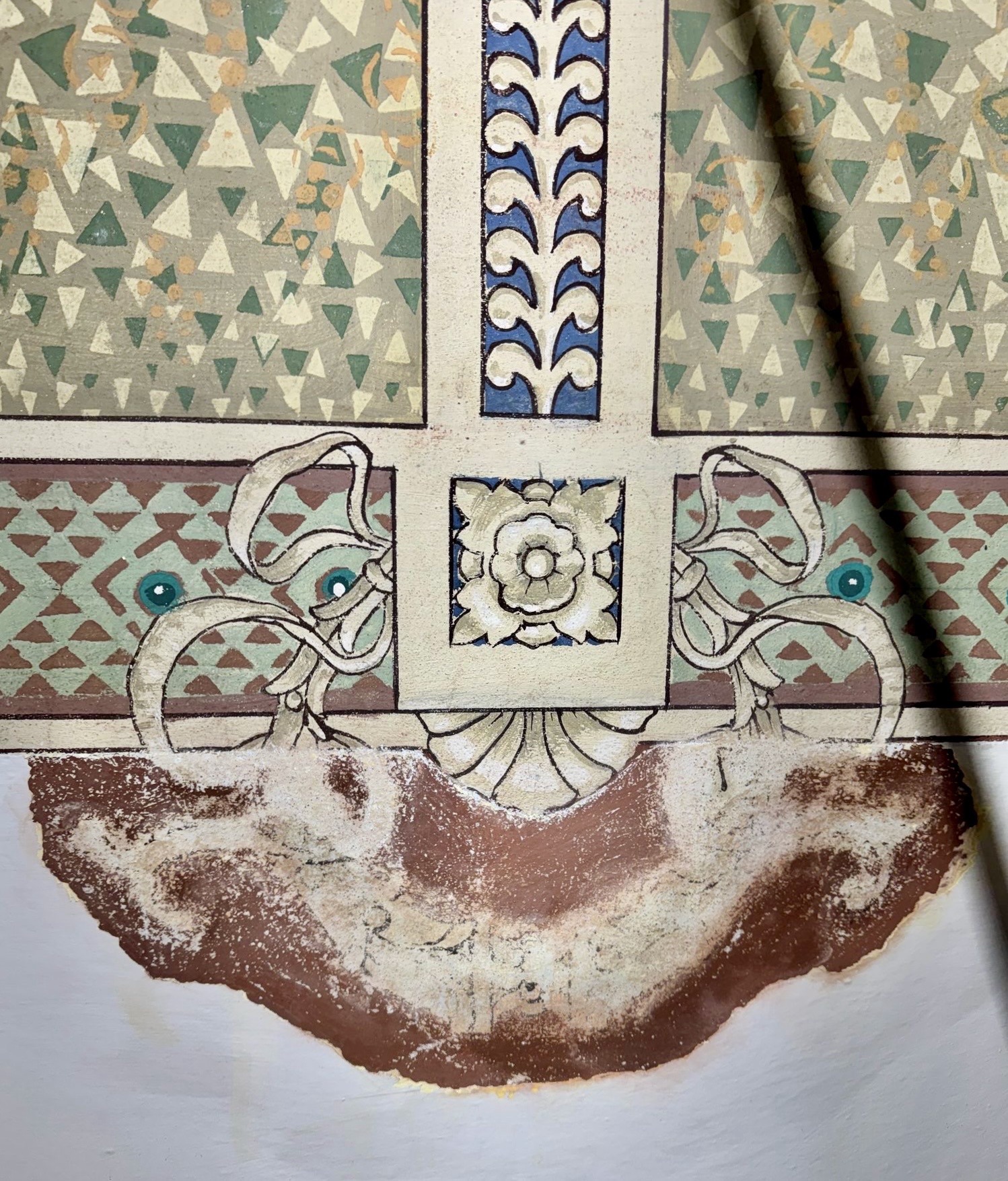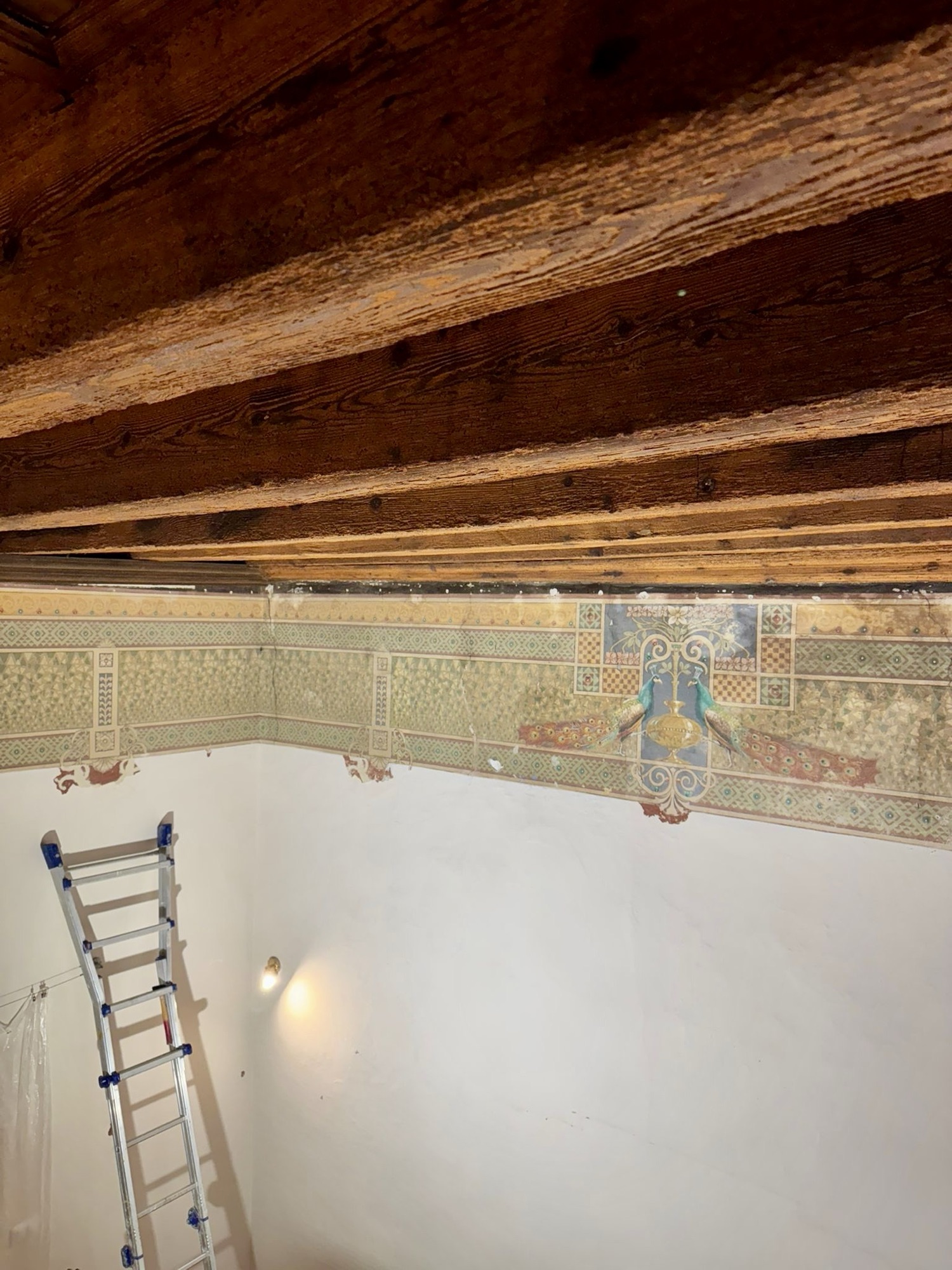 Thus far, together, we have uncovered and saved frescoes originating from different time periods, perhaps beginning from the 1600s and extending all the way into the first decade of the 20th century. Older frescoes peek from behind newer paintings, exquisitely showcasing contrasting styles of different centuries. It seems every hundred years or so, a new proprietor would arrive and decide to leave his or her mark by commissioning a new painting on top of an existing artwork.