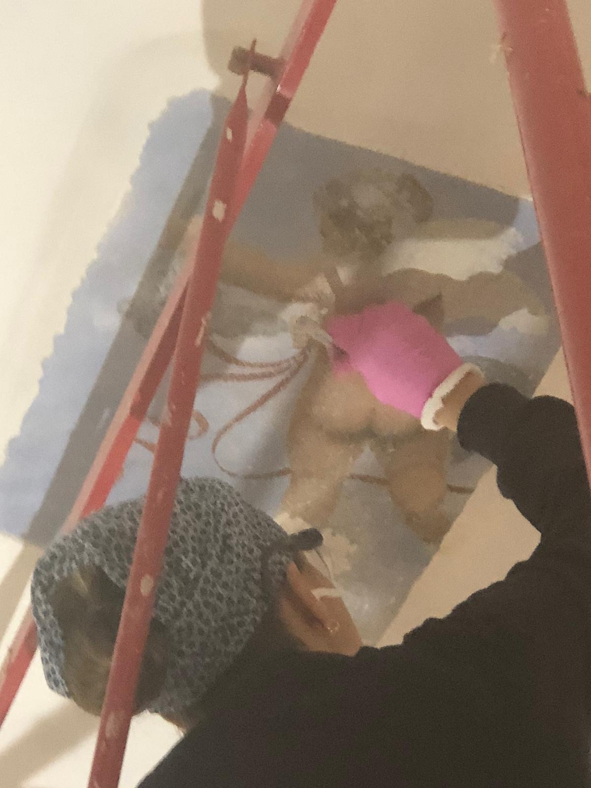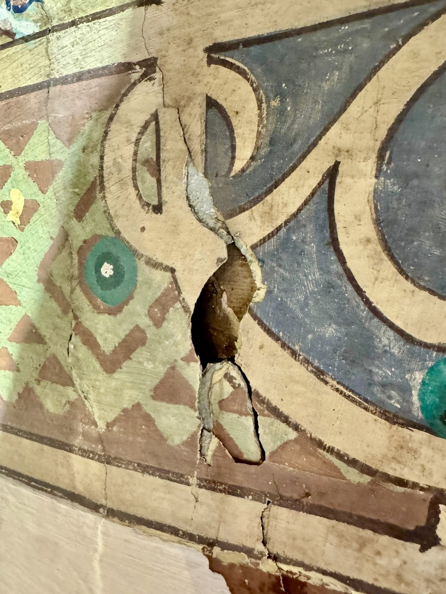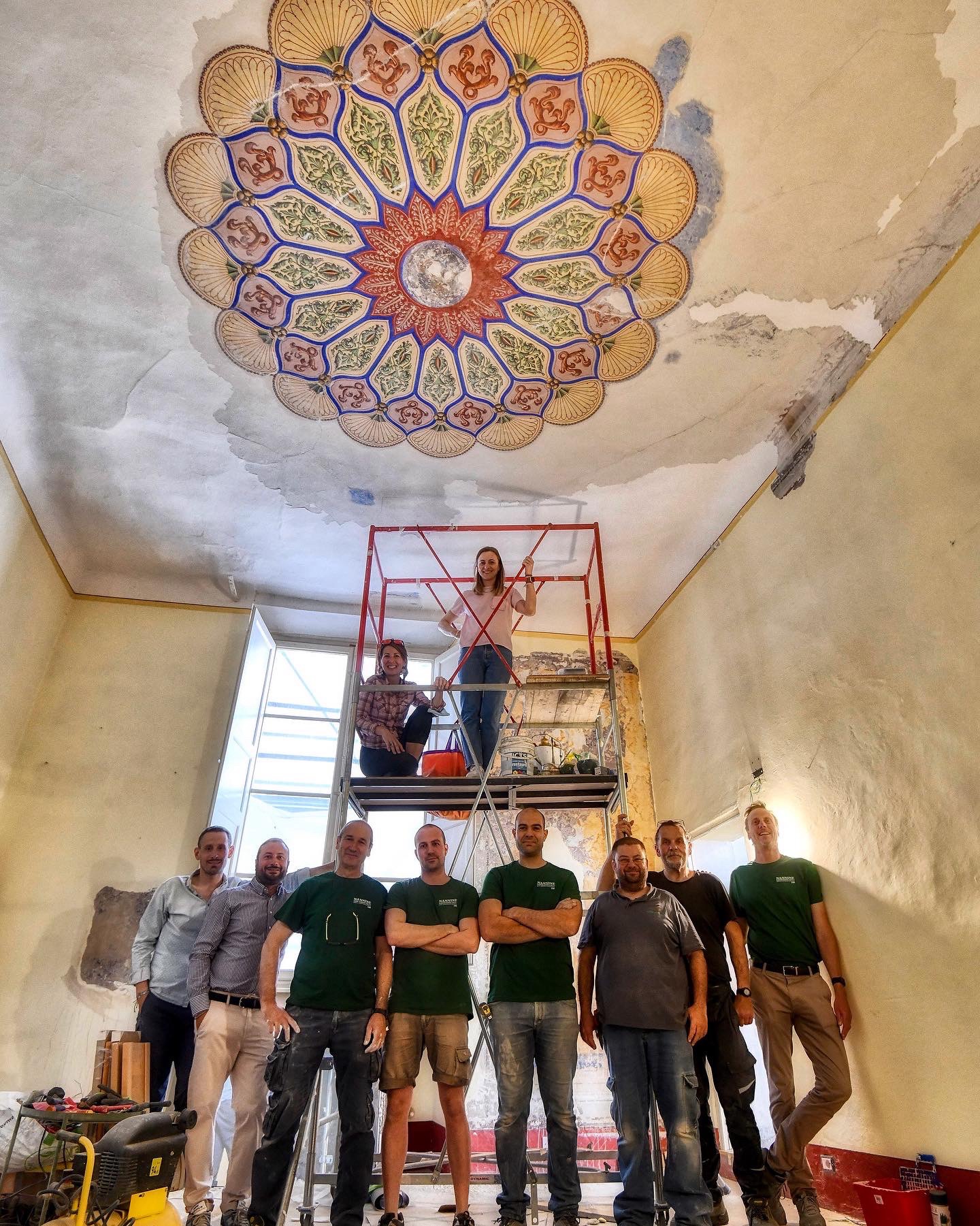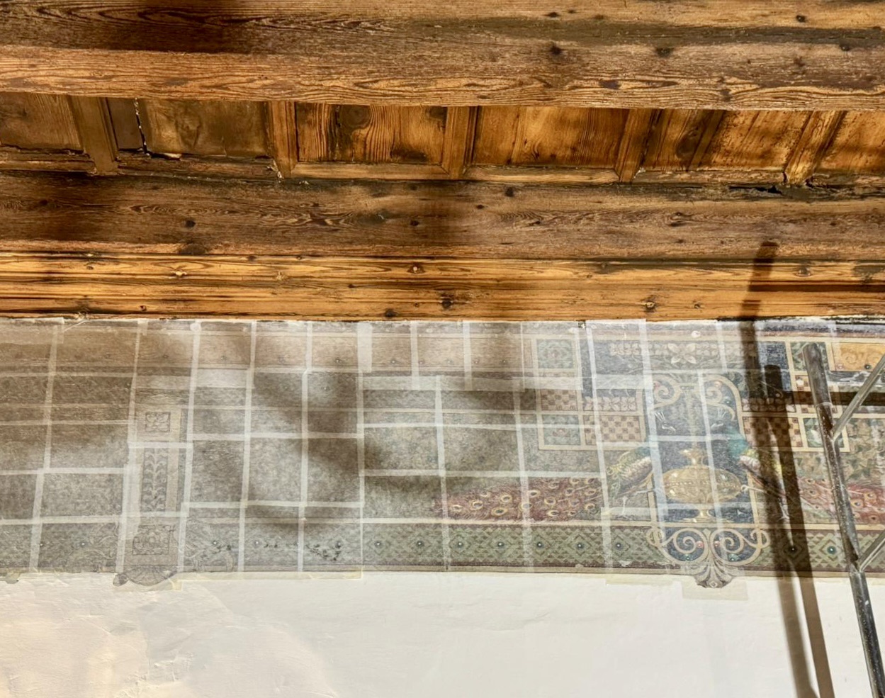 Thus far, together, we have uncovered and saved frescoes originating from different time periods, perhaps beginning from the 1600s and extending all the way into the first decade of the 20th century. Older frescoes peek from behind newer paintings, exquisitely showcasing contrasting styles of different centuries. It seems every hundred years or so, a new proprietor would arrive and decide to leave his or her mark by commissioning a new painting on top of an existing artwork.