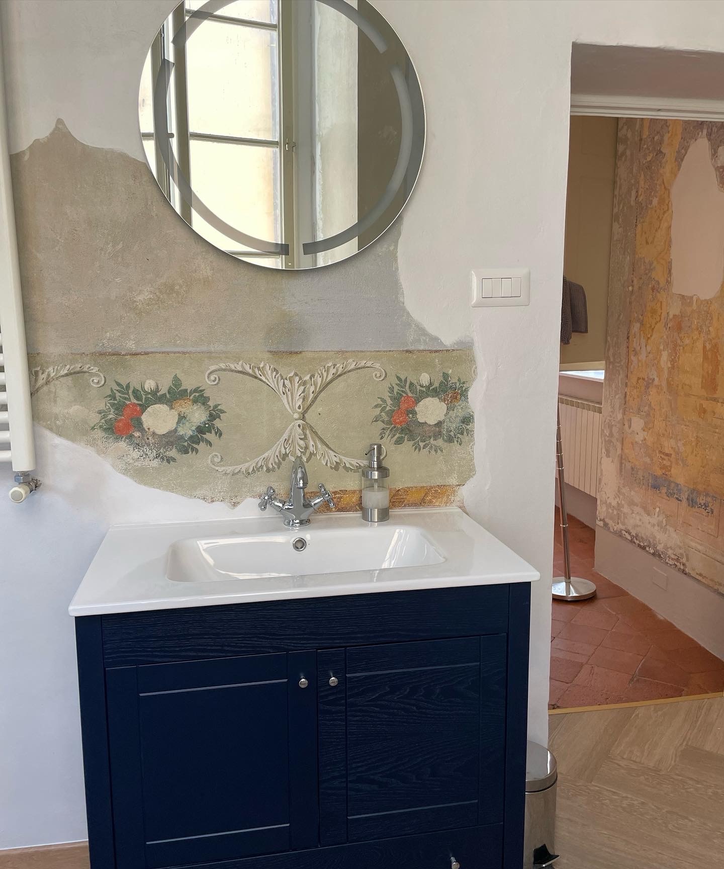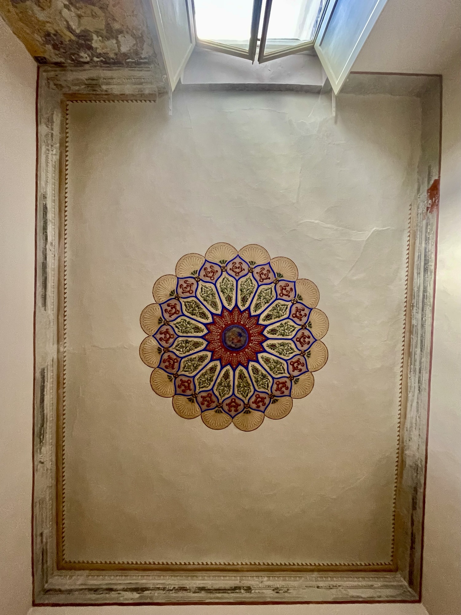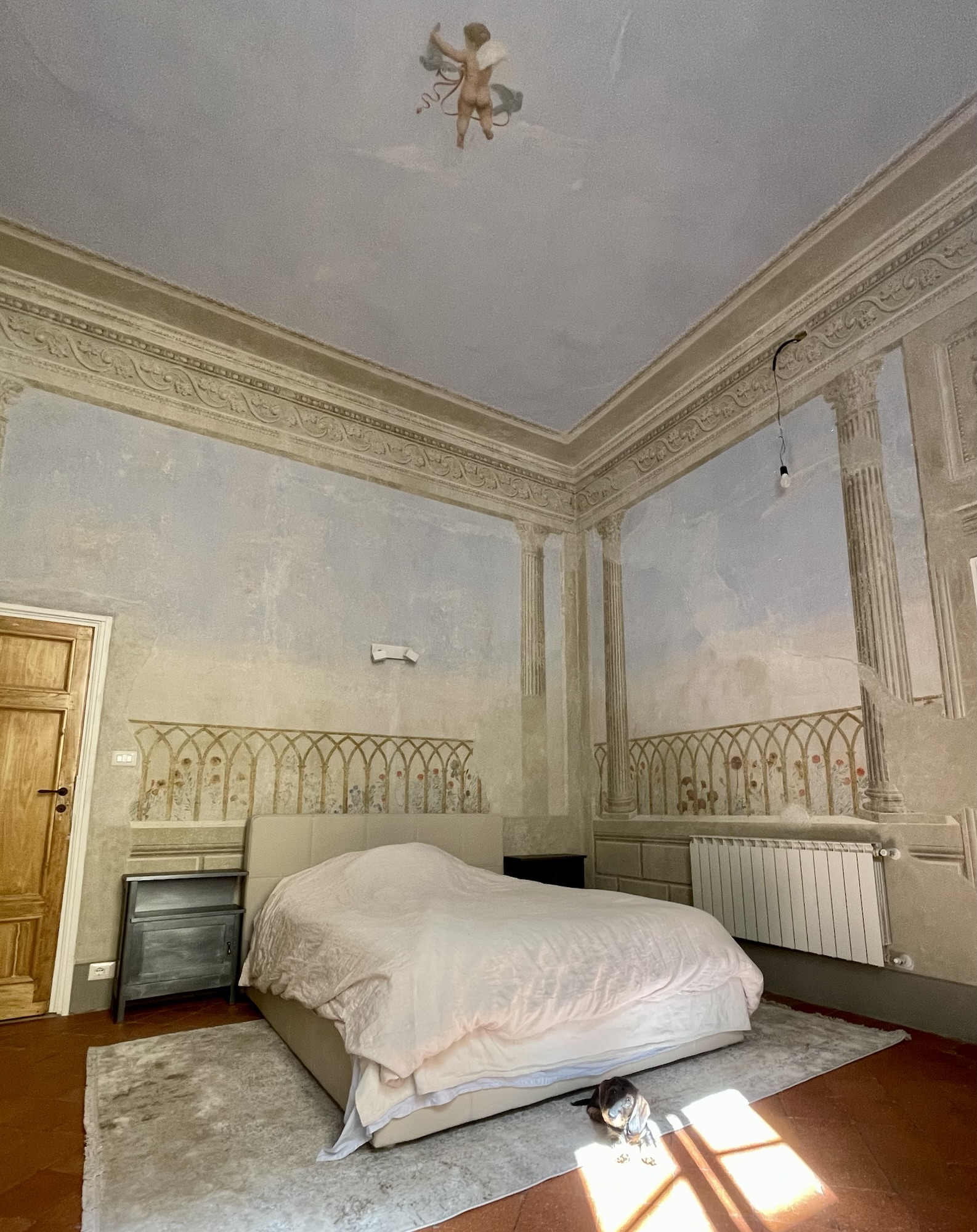 Garlands of flowers in the bathrooms. A putto cherub watching over a Venetian balcony at sunrise in the master bedroom. An eccentric 19th century geometric gem on the guest room ceiling. Multiple layers of alternating frescoes mingling and intertwining in the kitchen and hallway.