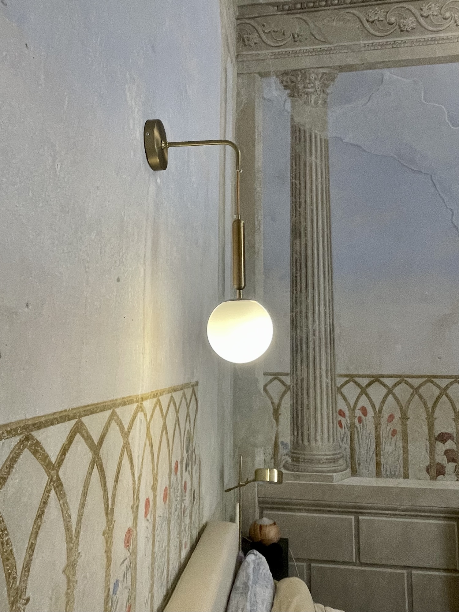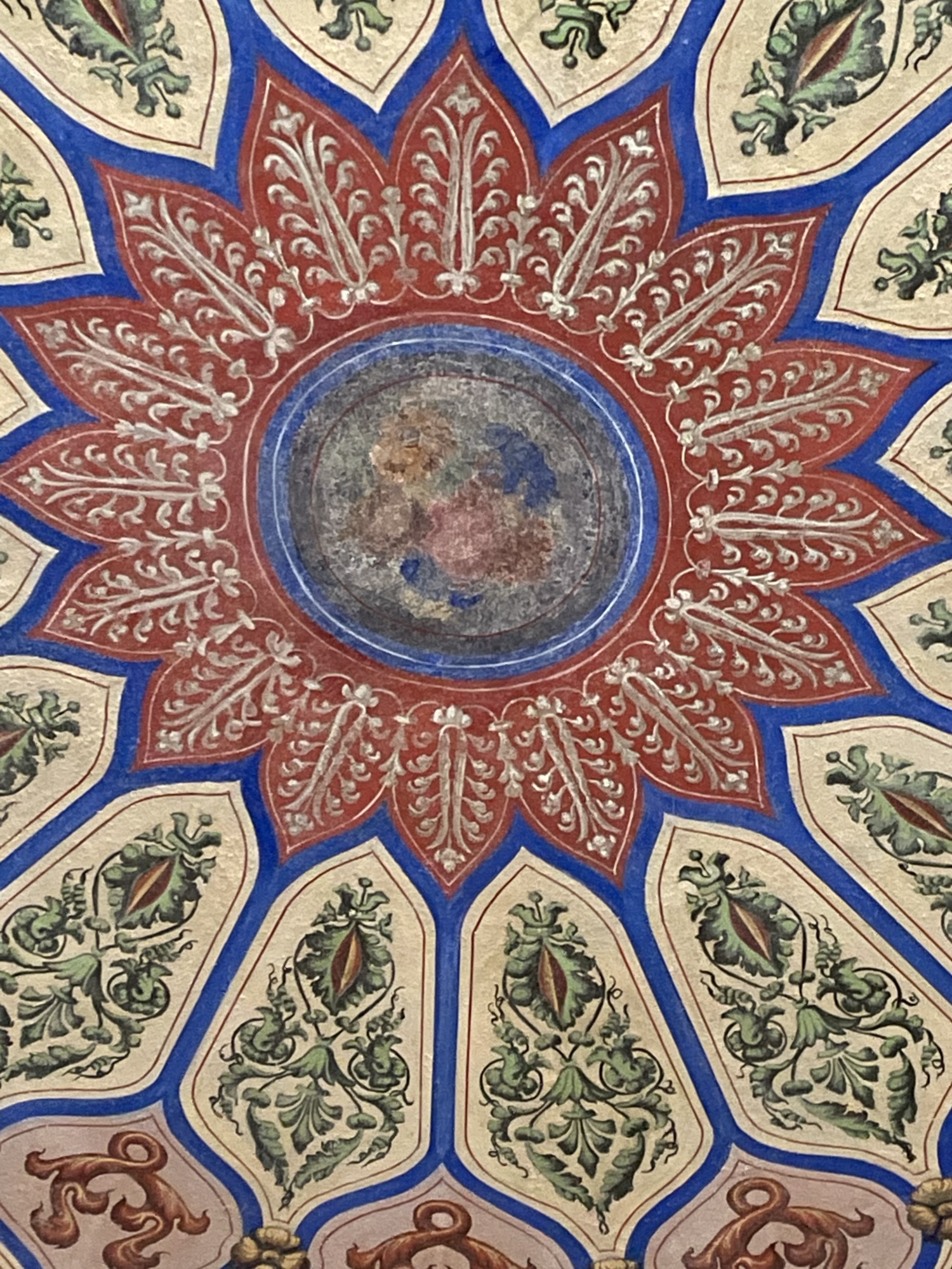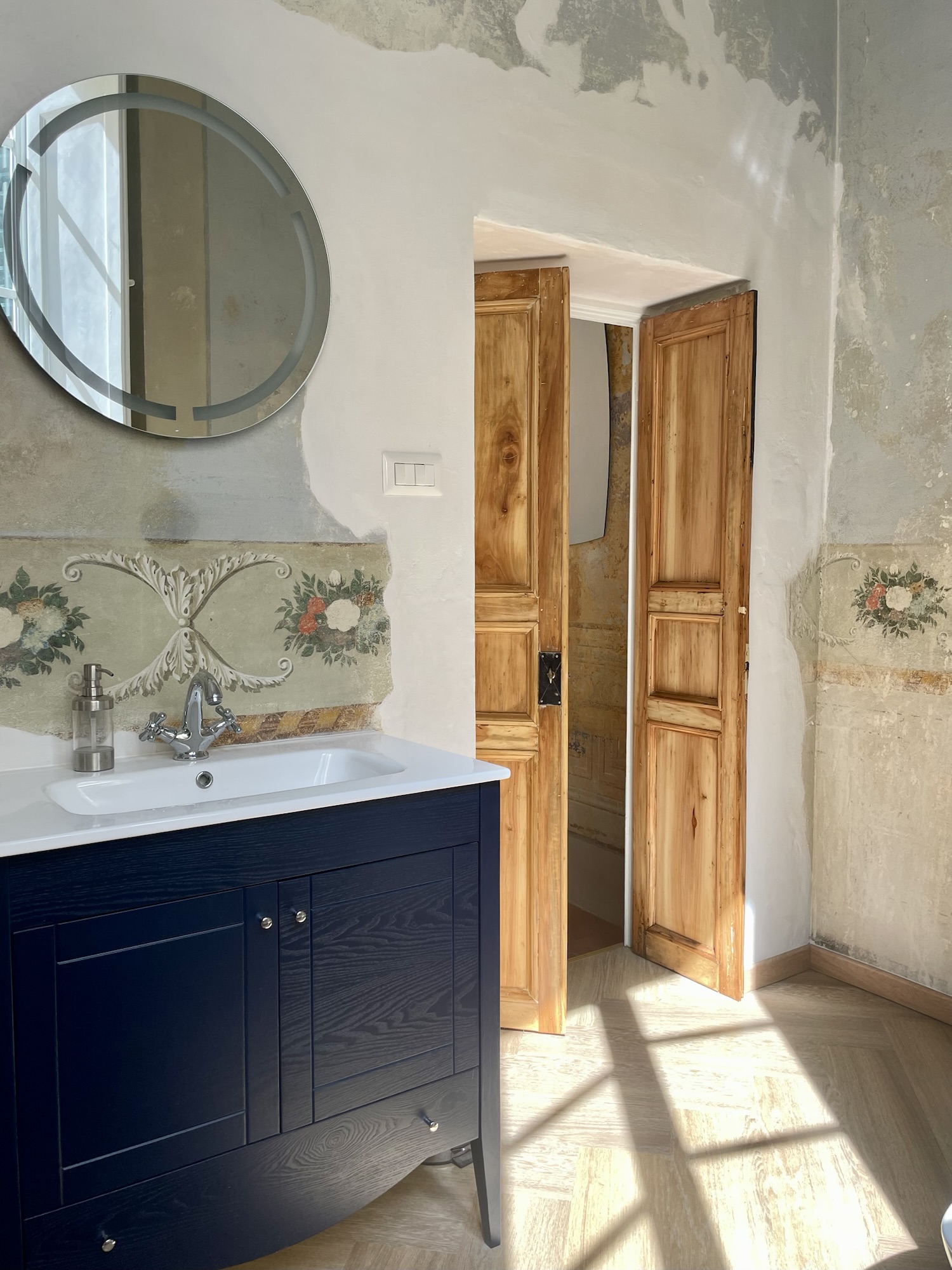 Garlands of flowers in the bathrooms. A putto cherub watching over a Venetian balcony at sunrise in the master bedroom. An eccentric 19th century geometric gem on the guest room ceiling. Multiple layers of alternating frescoes mingling and intertwining in the kitchen and hallway.