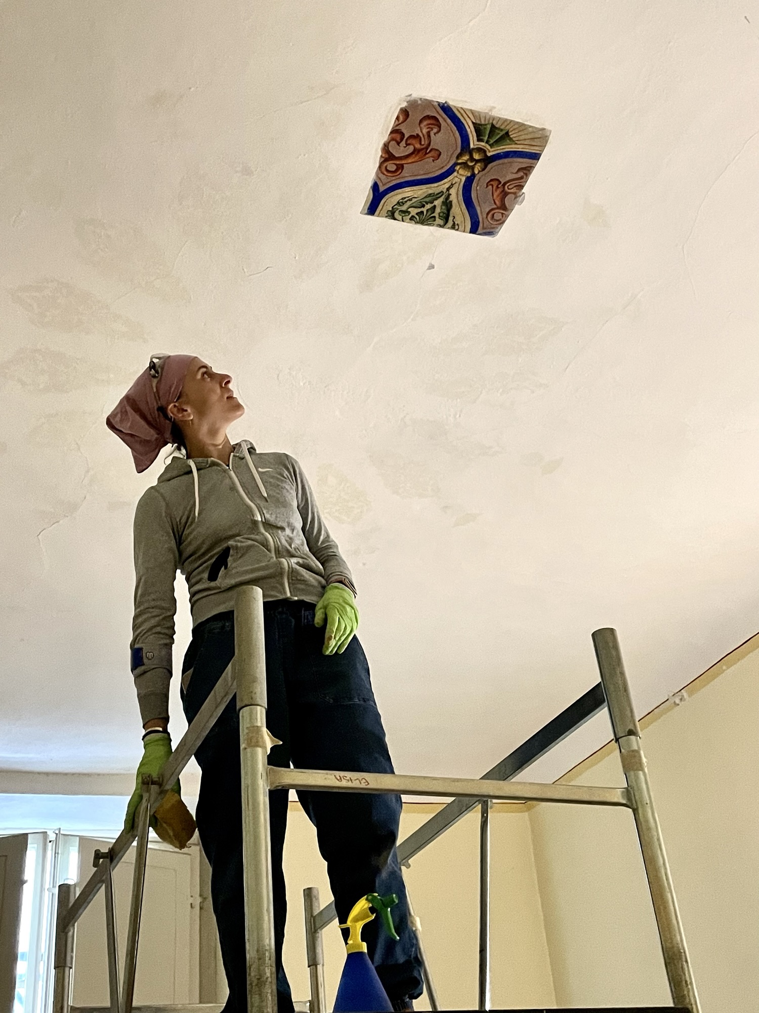 As soon as we began pulling down walls and demolishing bathrooms and kitchen, what we found was astounding. Perhaps those peacocks had been trying to tell us. There’s hidden beauty all around. Will you be brave enough to dig? We began to discover layer-upon-layer of historic frescoes in every room of the apartment. In short order, we have become amateur restoration experts while working along with an actual pro, the immensely talented artist Elisa Pasquini.
