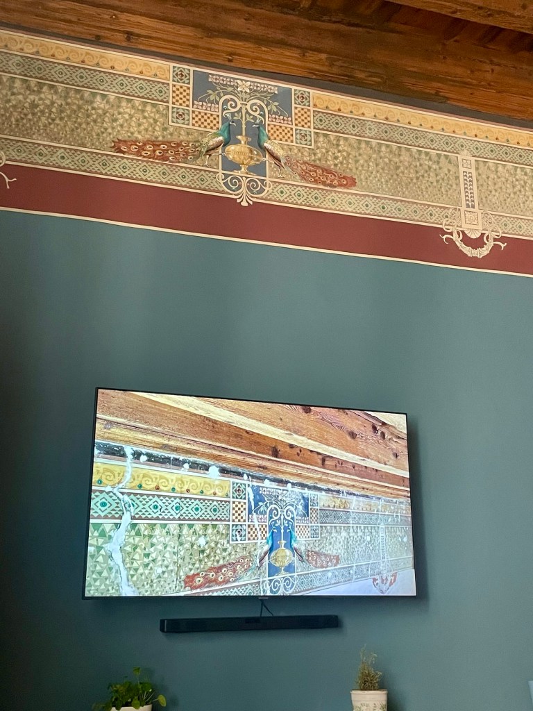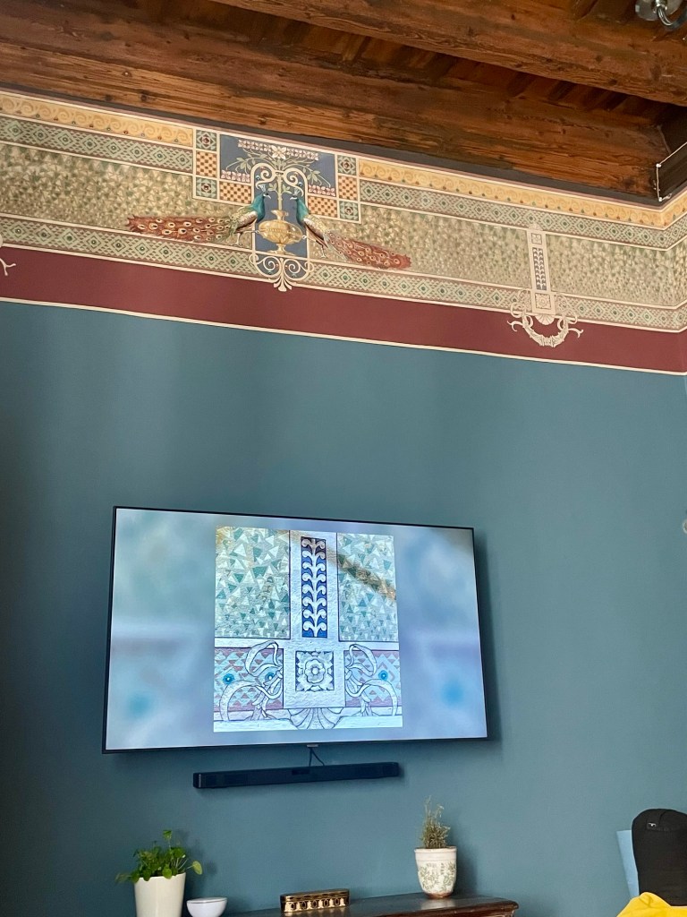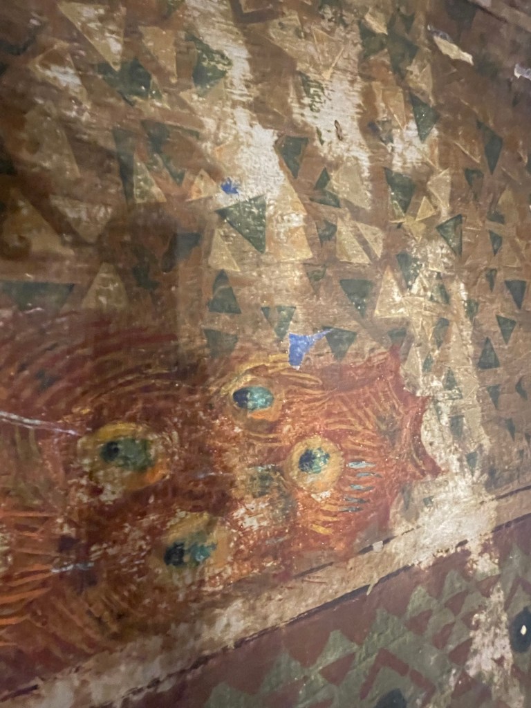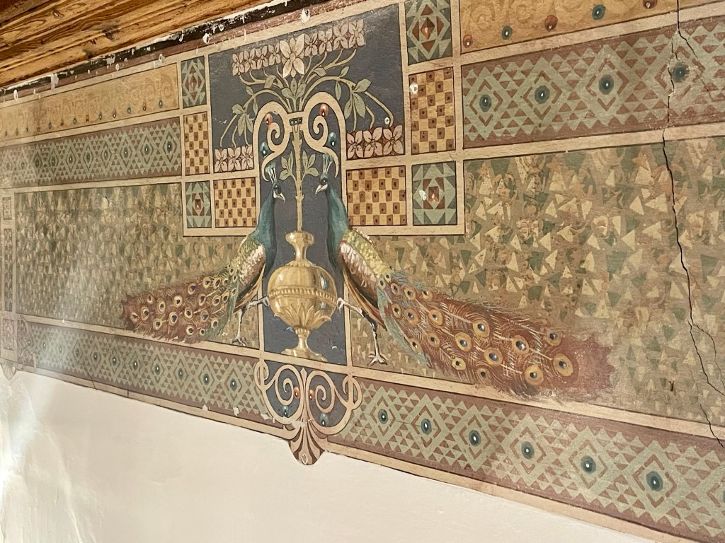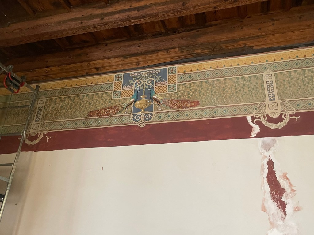 With this latest restoration project in the room we call Il Pavone (The Peacock), it seems somewhere in the late 1800s to early 1900s, the proprietors commissioned a new artwork to make their own individual mark and to represent the booming era of optimism and growth. Liberty style and art nouevuex were all the rage. We have no way of knowing if they were aware of earlier frescoes, or if the older works had already been painted over by previous generations. During our renovation, we found hints of the layers below, likely dating a century or two before.