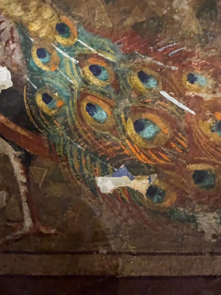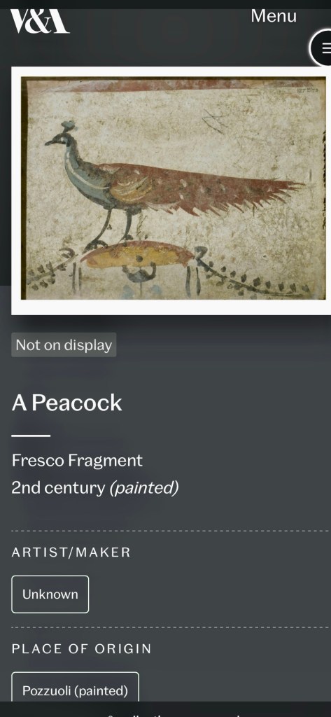 We also can’t know if the family specifically requested a painting featuring peacocks or if the artist suggested the idea. Peacocks featured heavily in the Liberty aesthetic, and the motif has been reoccurring since the earliest known frescoes, like this one dating from the 2nd century.