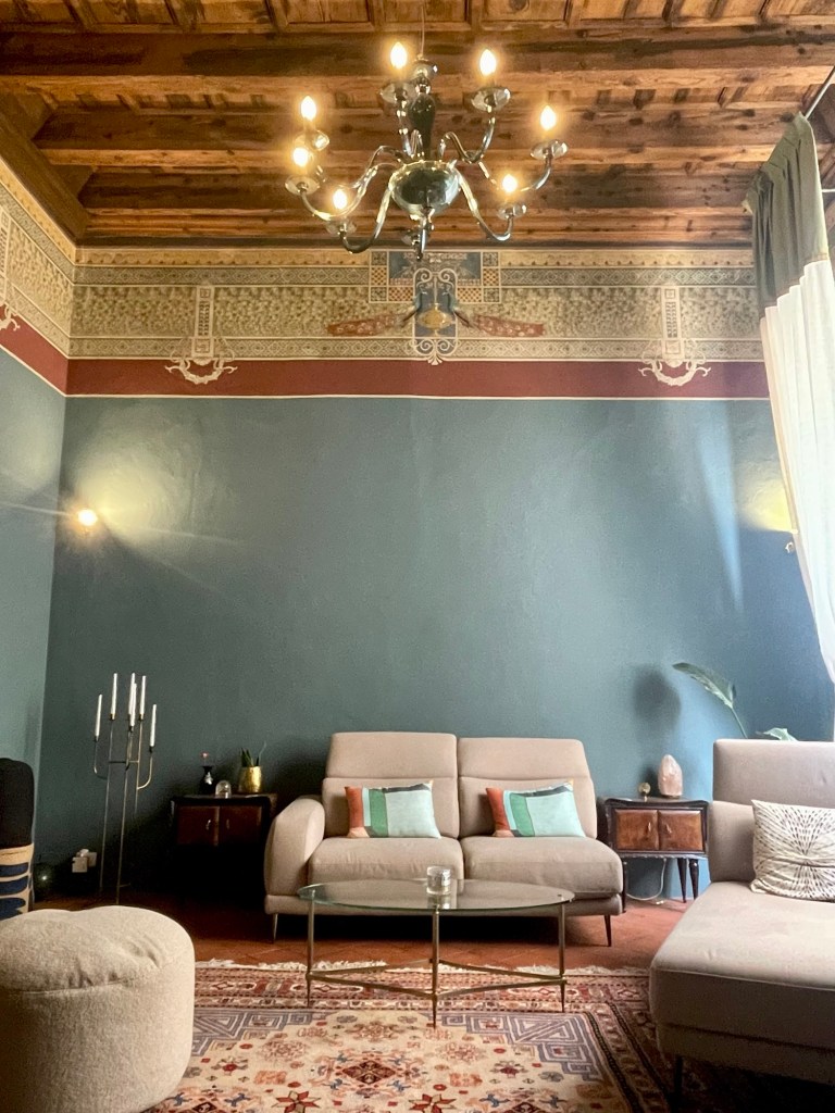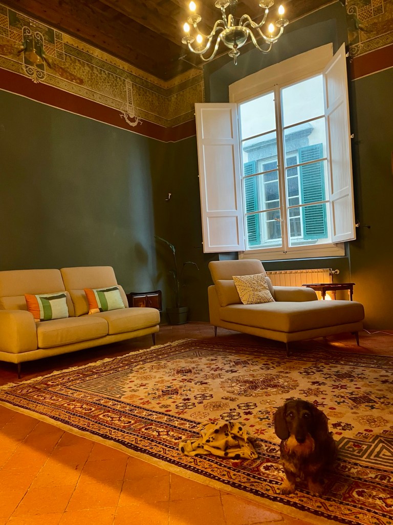 For us it’s a dream and privilege to play a tiny role in the story of this space. The building (palazzo) was constructed in the 1500s as the grand family home for a wealthy merchant. As was the fashion of the day, an entire floor of the palazzo was dedicated to welcoming and entertaining guests (with the family living on the floors above and servants in spaces below). The nobile floor (il piano nobile) was designed to dazzle. Hallmarks include extra large windows, wood-beamed or coffered ceilings, and, naturally, frescoes covering most walls. As we found during renovation of our apartment, when styles and inhabitants changed over the centuries, new paintings were commissioned to cover the old.